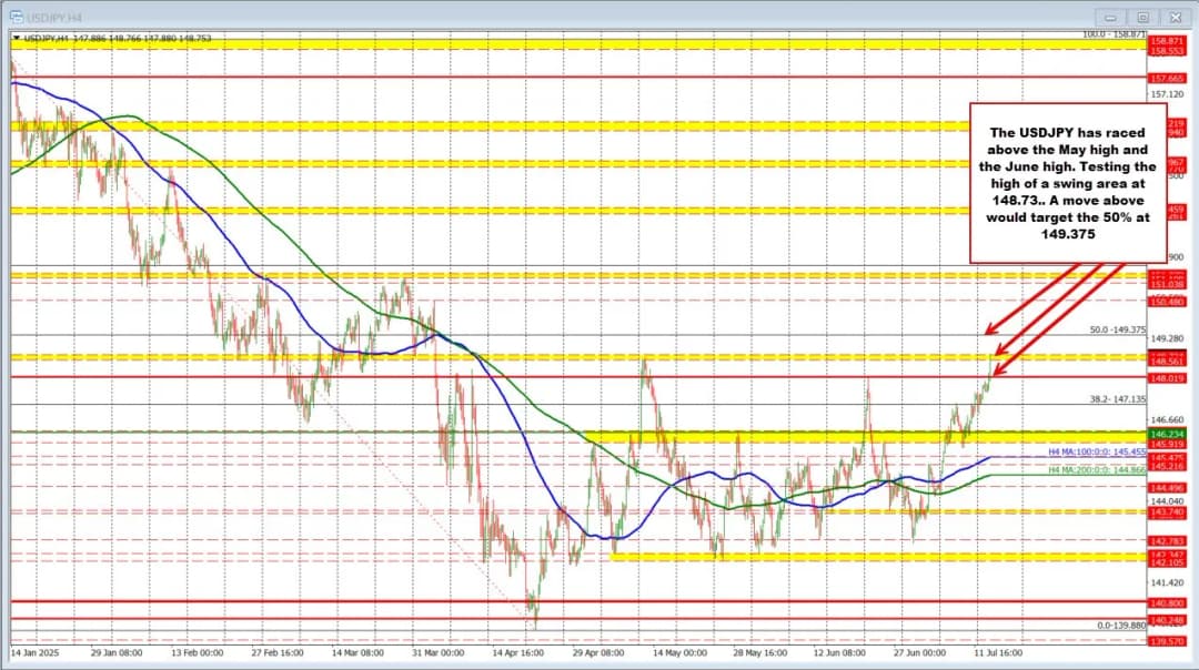 با نگاهی به نمودار چهار ساعته، یک منطقه نوسانی بین ۱۴۸.۵۶ و ۱۴۸.۷۳ وجود دارد. اگر قیمت از این سطح بالاتر برود، معاملهگران هدف بعدی را محدوده میانی ۵۰٪ حرکت نزولی از بالاترین نقطه ژانویه تا پایینترین نقطه آوریل (بازه در سال ۲۰۲۵) قرار میدهند. این نقطه میانی ۵۰٪ در قیمت ۱۴۹.۳۷۵ قرار دارد.