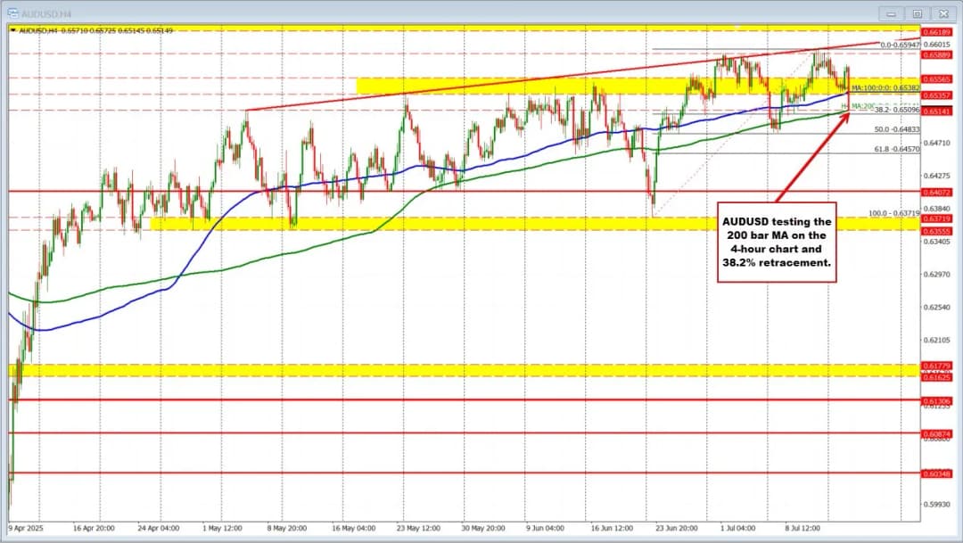 قیمت دلار استرالیا نسبت به دلار آمریکا (AUD/USD) اکنون در حال آزمودن میانگین متحرک ۲۰۰ دورهای در نمودار چهار ساعته در سطح ۰.۶۵۱۴ است. در صورت عبور از این سطح، فیبوناچی ۳۸.۲ درصد روند صعودی اخیر از کف ژوئن در ۰.۶۵۰۹۶ قرار دارد. شکست این دو سطح، راه را برای حرکت به سمت فیبوناچی ۵۰ درصد در ۰.۶۴۸۳۳ هموار میکند.