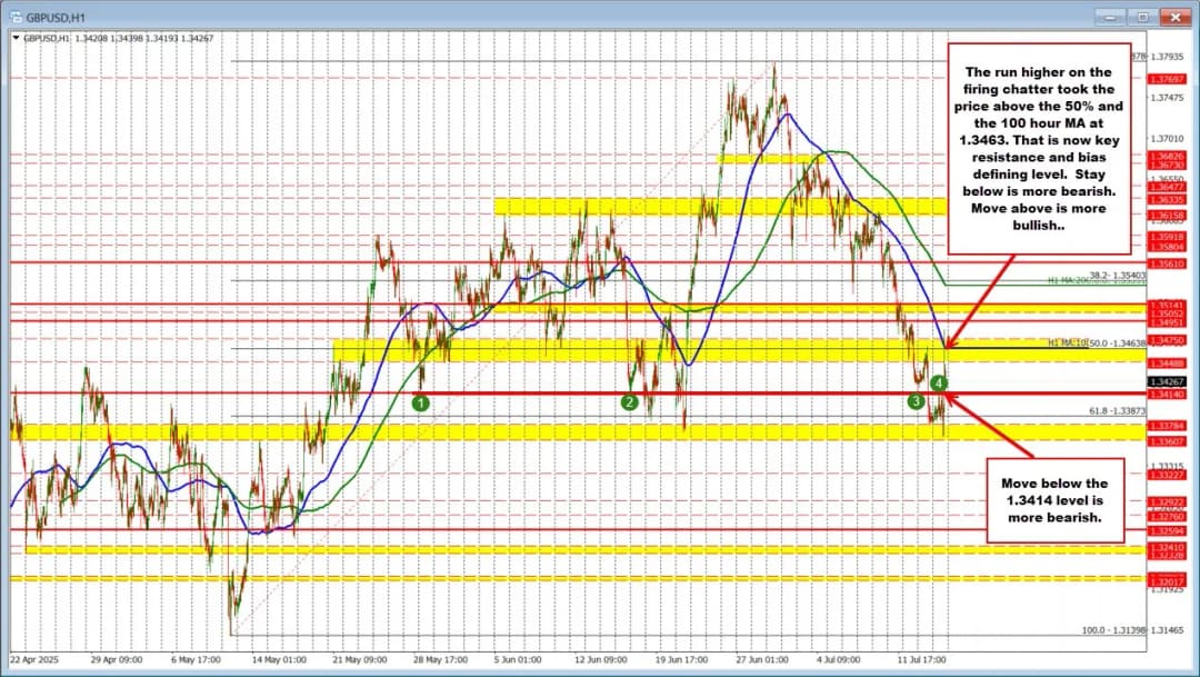 در آغاز معاملات آمریکا، پوند/دلار به محدودهای نوسانی بین ۱.۳۳۶۰۷ تا ۱.۳۳۷۸ حرکت کرد. با اعلام شایعات درباره برکناری پاول، این جفت ارز به صورت ناگهانی افزایش یافت و از میانگین متحرک ۱۰۰ ساعته و نقطه میانی ۵۰٪ دامنه از کف ماه مه، هردو در ۱.۳۴۶۳۸، عبور کرد.