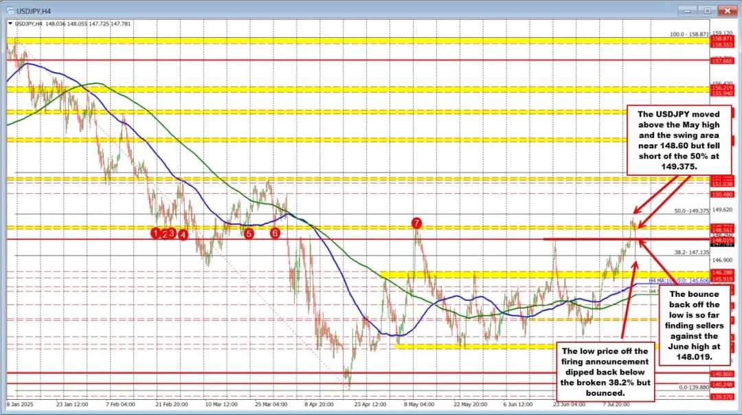 روز معاملاتی در جفت ارز دلار/ین، بالاتر از یک بازه نوسانی بین ۱۴۸.۵۶ تا ۱۴۸.۷۲ شروع شد. شایعات مربوط به برکناری پاول، این جفت ارز را به شدت پایین کشید؛ به گونهای که قیمت به زیر این محدوده و به زیر اوج ژوئن در ۱۴۸.۰۱۲ و همچنین به زیر سطح اصلاحی ۳۸.۲٪ حرکت کاهشی از اوج سال ۲۰۲۵ در ژانویه، یعنی ۱۴۷.۱۳۵ سقوط کرد.