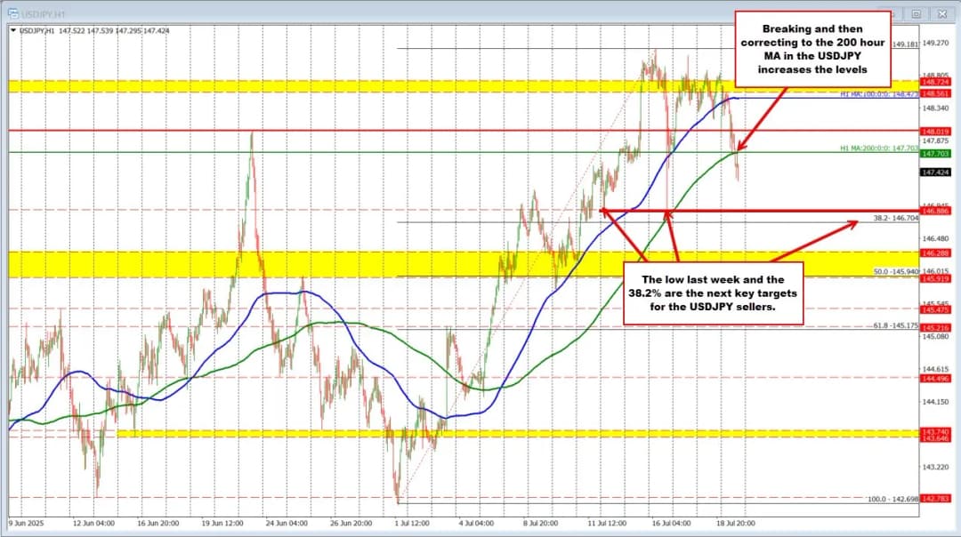 جفت ارز دلار/ین (USD/JPY) موفق به شکستن سطح میانگین متحرک ۲۰۰ ساعته به سمت پایین شده است و این باعث شده تمایل بازار در کوتاهمدت بیشتر نزولی شود. پس از افت اولیه زیر این سطح، جفت یک بار دیگر آن را در ناحیه ۱۴۷.۷۰۳ محک زد و سپس مجدداً تا کف جدید روزانه افت کرد.