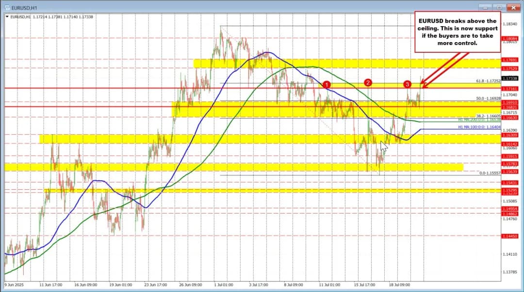 یورو نسبت به دلار موفق شده است از بالاترین نوسانات قیمتی چهارشنبه گذشته و همچنین بالاترین نرخ 11 جولای عبور کند. قیمت اکنون بالاتر از سطح ۶۱.۸٪ اصلاحی حرکت نزولی از بالاترین تا پایینترین قیمت در جولای قرار گرفته است. همه این سطوح بین ۱.۱۷۱۶ تا ۱.۱۷۲۵ قرار دارند. این ناحیه اکنون بهعنوان حمایت نزدیک عمل میکند. ماندن قیمت بالاتر از این سطح، روند صعودی را تقویت میکند. اهداف بعدی صعودی بین ۱.۱۷۵۳ تا ۱.۱۷۶۹ هستند. عبور از این محدوده، هدف قیمتی را به ۱.۱۸۰۸ و سپس رکورد سال ۲۰۲۵ در ۱.۱۸۳۰ میرساند.