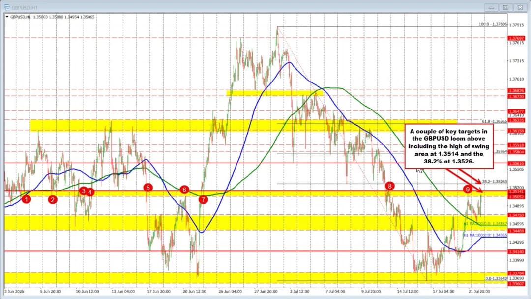 پوند نیز در برابر دلار به منطقهای بین ۱.۳۵۰۵ تا ۱.۳۵۱۴ بازگشته است. دیروز هم سقف قیمتی در همین ناحیه متوقف شد. از ابتدای ماه ژوئن، چندین سقف و کف نوسانی مهم در این سطح ثبت شدهاند (به نقاط دایرهای قرمز در نمودار دقت کنید). عبور از این منطقه میتواند توجه معاملهگران را به سطح بازگشتی ۳۸.۲٪ حرکت نزولی از اوج ۱ جولای جلب کند؛ این سطح در ۱.۳۵۲۶ قرار دارد. صعود پایدار بالای این سطح به معنی تسلط بیشتر خریداران است.