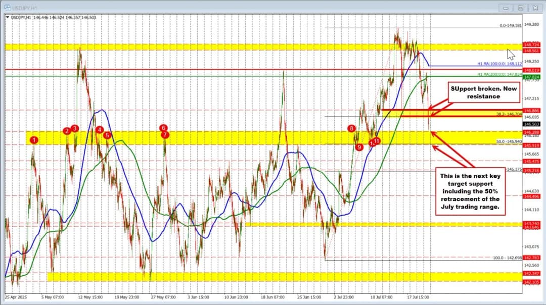 دلار در مقابل ین نیز به زیر سطح بازگشتی ۳۸.۲٪ حرکت افزایشی از کف ۱ جولای در ۱۴۶.۷۰۴ سقوط کرد و اکنون تا محدوده نوسانی بین ۱۴۵.۹۲ تا ۱۴۶.۲۸۸ پایین آمده است. نقطه میانی ۵۰٪ حرکت صعودی از کف جولای در این ناحیه و بر روی ۱۴۵.۹۴ قرار دارد.