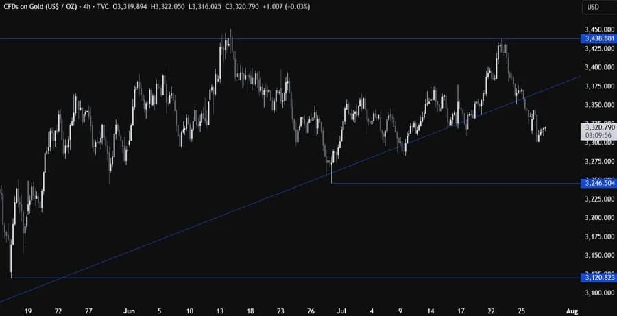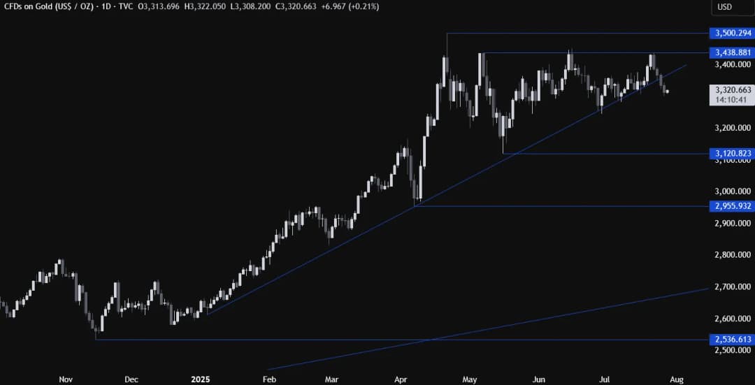 در نمودار روزانه مشاهده میشود که طلا اخیراً زیر خط روند اصلی شکسته و با ورود فروشندگان بیشتر، افت بیشتری را تجربه کرده است. هدف بعدی سطح کلیدی ۳۱۲۰ است که احتمالاً خریداران در آن نقطه برای بازگشت قیمت به سمت مقاومت ۳۴۳۸ وارد عمل خواهند شد.