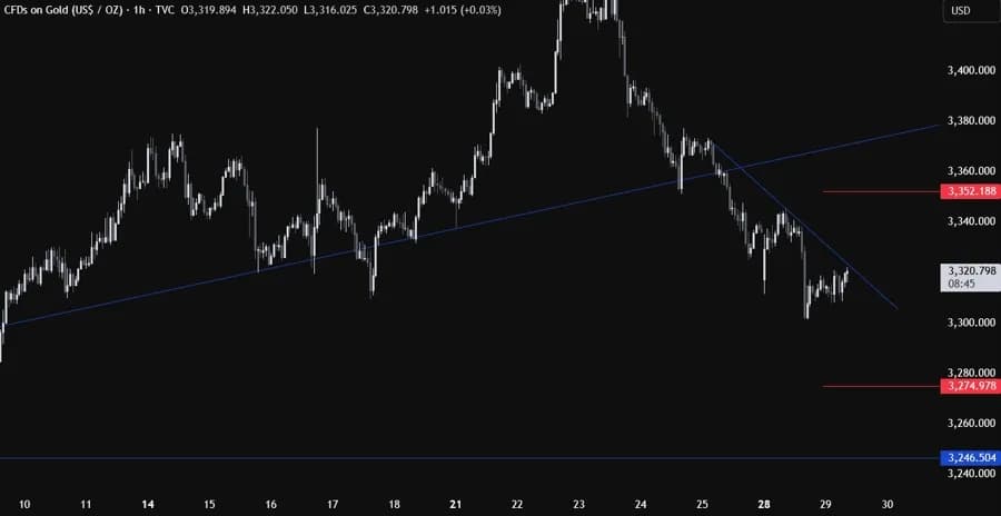 در نمودار ۱ ساعته، شاهد یک خط روند نزولی کوچک هستیم که بر قدرت فروشندگان تأکید دارد. فروشندگان احتمالاً با حفظ ریسک مشخص در بالای این خط، به فشار نزولی خود ادامه خواهند داد و به دنبال کفهای جدید خواهند بود؛ در حالی که خریداران به دنبال شکست این خط صعودی و رساندن قیمت به خط روند شکسته اصلی در محدوده ۳۳۷۰ هستند. خطوط قرمز، محدوده متوسط روزانه امروز را نشان میدهند.