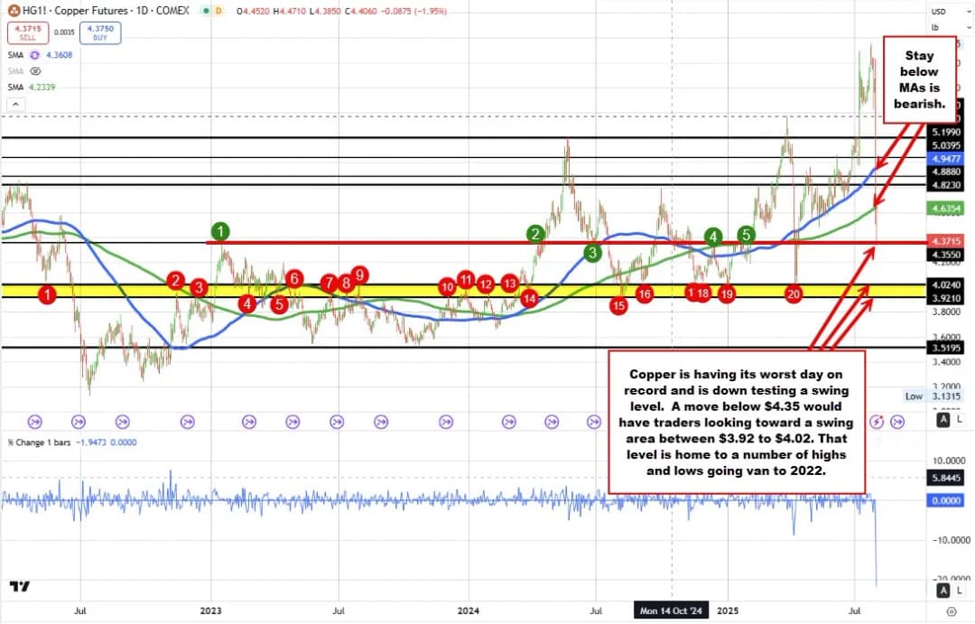 با مشاهده نمودار روزانه، قیمت مس افت شدیدی از سقف اخیر ۵.۹۵ دلار داشته و امروز به کف ۴.۳۳ دلار رسید. قیمت فعلی کمی بالاتر از این کف و در ۴.۳۷ دلار معامله میشود. این حرکت باعث شده قیمت به زیر میانگین متحرک ۱۰۰ روزه (۴.۹۴ دلار) و ۲۰۰ روزه (۴.۶۳ دلار) سقوط کند که نشاندهنده تغییر شدید مومنتوم به سمت نزول است.