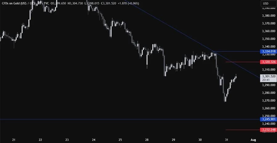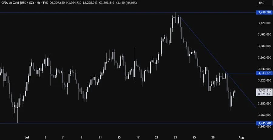 در نمودار ۴ ساعته، یک خط روند نزولی وجود دارد که بر تمایلات نزولی بازار تاکید میکند. به احتمال زیاد فروشندگان با ریسک محدود بالای این خط سعی میکنند قیمت را به سمت سطوح پایینتر هدایت کنند. در مقابل، خریداران به دنبال عبور از خط روند و رسیدن به سطح ۳۳۳۳ خواهند بود؛ و در صورت شکست مقاومت میتوانند موج صعودی را تا مقاومت ۳۴۳۸ ادامه دهند.