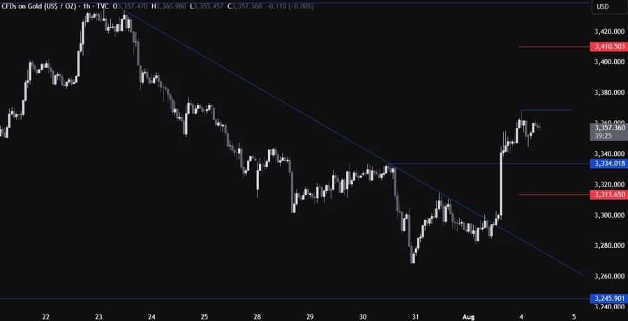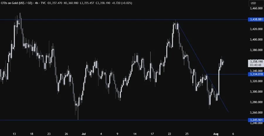 در نمودار ۴ ساعته مشاهده میشود که یک خط روند نزولی محرک فشار فروش بوده است. قیمت موفق به شکست این خط به سمت بالا شد و با انتشار دادههای NFP ضعیف، خریداران با جدیت بیشتری وارد شدند. قیمت هماکنون بالاتر از قله اخیر در سطح ۳۳۳۴ معامله میشود که میتواند نقش حمایت را ایفا کند.