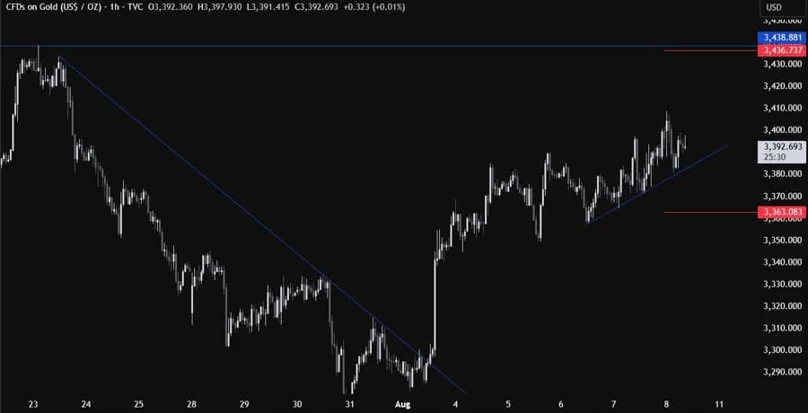 در نمودار ۱ ساعته یک خط روند صعودی کوتاهمدت وجود دارد که مومنتوم خریداران را مشخص میکند. معاملهگران خریدار احتمالاً به این خط روند تکیه خواهند کرد و با حد ضرر زیر خط، برای فشار به سمت مقاومت تلاش میکنند. فروشندگان نیز به دنبال شکست این خط روند خواهند بود تا اصلاح قیمت تا سطح ۳۳۵۰ دلار تداوم یابد. خطوط قرمز محدوده میانگین روزانه امروز را نشان میدهند.