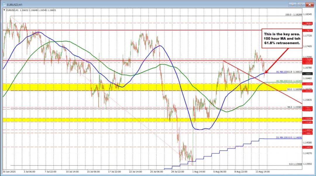 یورو/دلار از 1.16807 به 1.1648 سقوط کرد. این افت، قیمت را زیر میانگین متحرک ۱۰۰ ساعته و سطح ۶۱.۸٪ در 1.16615 برد. اکنون قیمت در نزدیکی این سطوح همگرا نوسان میکند. این ناحیه را برای نشانههای تکنیکال زیر نظر داشته باشید. در سمت نزولی، میانگین متحرک ۲۰۰ ساعته در 1.16339 قرار دارد و شکست پایدار زیر آن به سوگیری نزولی اضافه میکند.