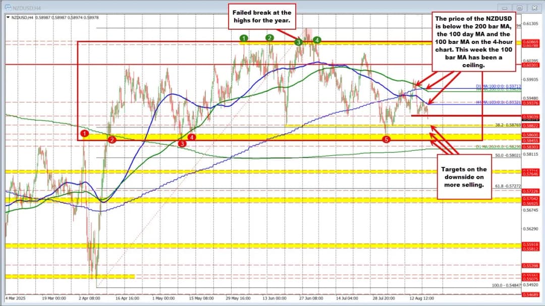 نگاهی به نمودار ۴ ساعته نشان میدهد که جفت ارز عمدتاً از آوریل تاکنون بین ۰.5845 و 0.6087 معامله شده است (به جعبه قرمز مراجعه کنید). با این حال، در هفتههای اخیر تصویر تکنیکی منفیتر شده است. به جز چند جهش کوتاه هفته گذشته که موقتا قیمت را بالای میانگین متحرک ۲۰۰ بازهای در نمودار ۴ ساعته برد، قیمت تحت فشار آن سطح باقی مانده و آن را به عنوان یک سقف تکنیکی قدرتمند تقویت کرده است.