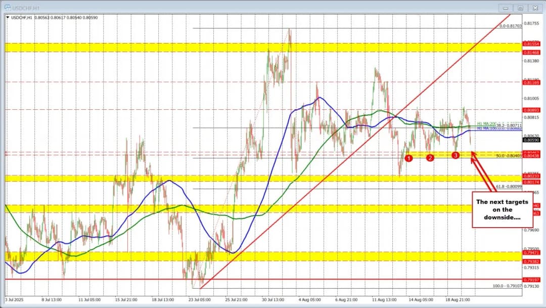 جفت USDCHF بالای میانگینهای متحرک ساعتی 100 و 200 بین 0.8066 و 0.8073 معامله میشد. قیمت تا کف جدید سشن حرکت کرده و روی 0.8054 قرار گرفت. هدف بعدی میتواند قیمتهای پایین پنج روز گذشته بین 0.80438 و 0.80467 باشد. اصلاح 50% از محدوده از کف 23 ژوئیه نیز نزدیک آن ناحیه و حوالی 0.8041 قرار دارد. اگر قیمت بتواند زیر آن محدوده برود، راه برای ادامه فروش باز میشود و سوگیری نزولی افزایش خواهد یافت.