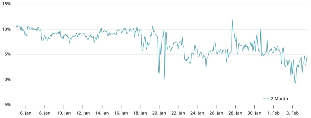 قراردادهای آتی ماهانه SOL معمولاً با پریمیوم نسبت به قیمتهای لحظهای معامله میشوند که نشاندهنده ریسک اضافی پذیرفته شده توسط فروشندگان به دلیل دوره تسویه طولانیتر است. در شرایط بازار خنثی، این پریمیوم سالانه بین ۵٪ تا ۱۰٪ متغیر است. قرائتی زیر این آستانه نشاندهنده کاهش تقاضا از موقعیتهای خرید است.