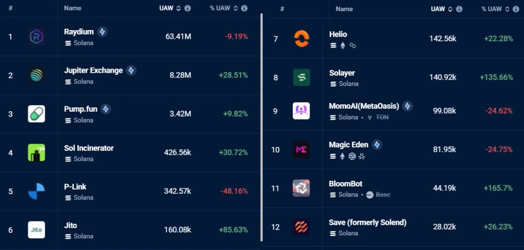 عوامل کلیدی در رشد TVL سولانا شامل Meteora، که در ۳۰ روز ۱۶۲٪ افزایش داشت، Binance Staked SOL، با ۲۳٪ افزایش، و Marinade Finance، که ۱۵٪ رشد کرد، هستند. این جریانهای ورودی به سولانا کمک کردند تا ۲۴۶ میلیون دلار کارمزد شبکه ماهانه تولید کند - که به طور قابل توجهی بیشتر از ۱۳۳ میلیون دلار اتریوم در همان دوره است. قابل توجه است که سه مورد از پنج DApp سودآور برتر به اکوسیستم سولانا تعلق دارند: Jito، Raydium و Meteora.