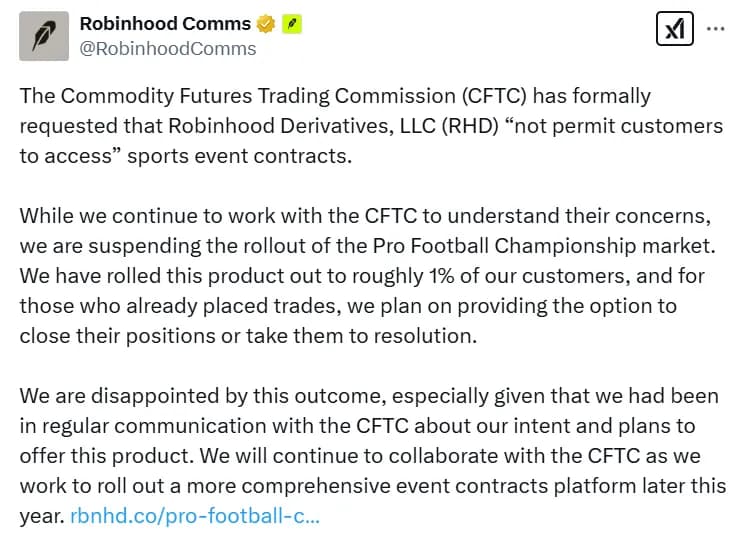 رابینهود مارکتس پس از دریافت درخواست کمیسیون معاملات آتی کالا (CFTC) برای قطع دسترسی مشتریانش به قراردادهای این رویداد، شرطبندیهای سوپربول را متوقف کرده است. این توقف تنها یک روز پس از راهاندازی این محصول توسط رابینهود و در همکاری با بازار پیشبینی Kalshi صورت میگیرد که اجازه میداد شرطبندی روی نتیجه بازی فیلادلفیا ایگلز مقابل کانزاس سیتی چیفز در ۹ فوریه در مسابقات قهرمانی سوپربول لیگ ملی فوتبال (NFL) انجام شود.