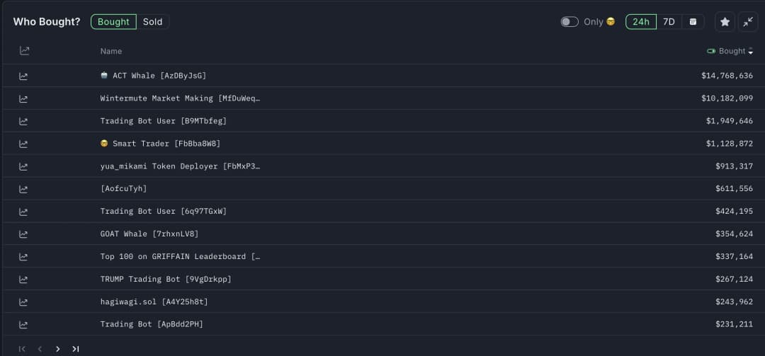 دادههای درون زنجیرهای نشان میدهند که سرمایهگذاران در حال خرید این میم کوین هستند. دو معاملهگر در ۲۴ ساعت گذشته توکنهایی به ارزش بیش از ۱۰ میلیون دلار خریداری کردهاند. دو نفر از آنها سفارشهای خرید باز کرده و دو نفر دیگر توکنهایی به ارزش بیش از ۱ میلیون دلار خریداری کردهاند.