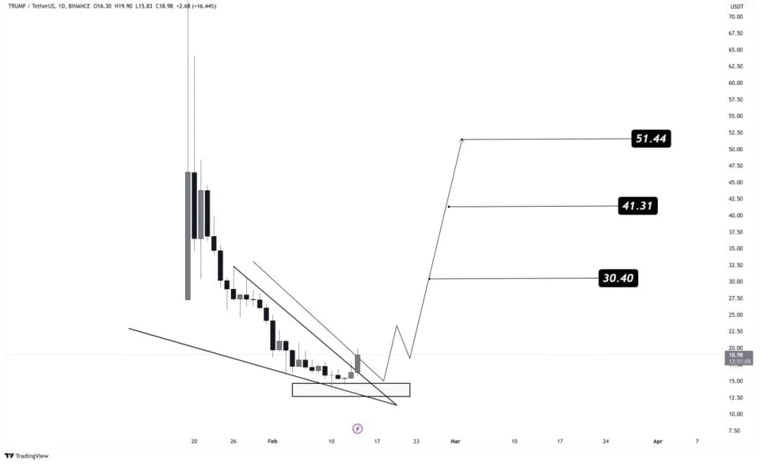 در همین حال، Rose Premium Signals یک پیشبینی قیمت ۵۱ دلاری برای سکه ترامپ ارائه داده و به الگوی کنج نزولی اشاره کرده است. او گفت: