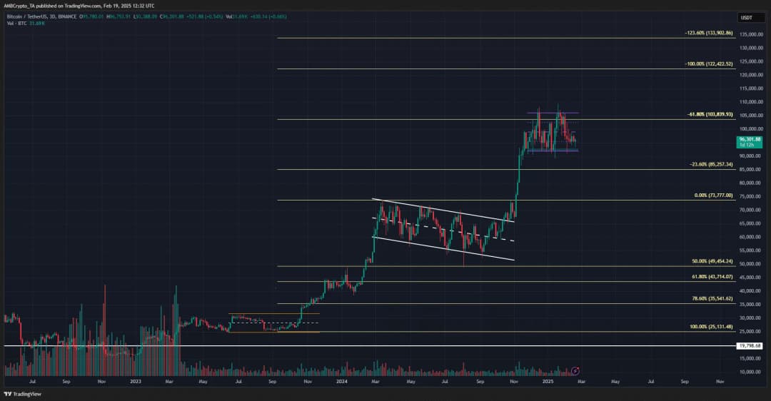 نمودار هفتگی نشان میدهد که بیت کوین علیرغم نوسانات شدید احساسات، ساختار صعودی محکمی دارد. با وجود چشمانداز کلان اقتصادی ترسناک در بازارهای ایالات متحده و نوسانات مرتبط با تعرفهها در برخی بازارها، بیت کوین از کف محدوده 92 هزار دلاری دفاع کرده است. ممکن است در هفتههای آینده به محدوده 88 هزار تا 90 هزار دلار کاهش یابد، اما این کاهش میتواند یک فرصت خرید باشد.