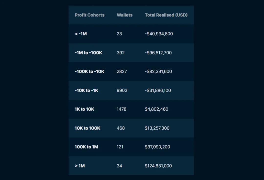 حدود ۱۴۷۸ دارنده کیف پول با ضرر تحققیافته بین ۱۰۰۰ تا ۱۰۰۰۰ دلار مواجه شدند که مجموعاً ۴.۸ میلیون دلار ضرر را تشکیل میدهند. بیش از ۲۸۰۰ کیف پول کریپتو بین ۱۰۰۰۰ تا ۱۰۰۰۰۰ دلار ضرر کردند که مجموعاً ۸۲.۴ میلیون دلار ضرر را تشکیل میدهند؛ ۳۹۲ کیف پول دیگر بین ۱۰۰۰۰۰ تا ۱ میلیون دلار ضرر کردند که مجموعاً حدود ۹۶.۵ میلیون دلار ضرر را تشکیل میدهند. ۲۳ کیف پول دیگر که بیش از ۱ میلیون دلار ضرر کردند، مجموعاً ۴۰.۹ میلیون دلار ضرر را ثبت کردند.