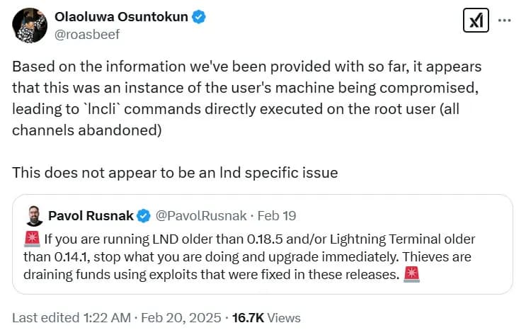 مدیر ارشد فناوری Lightning Labs، شرکت پشت شبکه مقیاسپذیری بیت کوین، باگ جدیدی را که میتواند به سوءاستفادهکنندگان اجازه دهد وجوه را از نودهای لایتنینگ تخلیه کنند، بیاهمیت جلوه داده است. «بر اساس اطلاعاتی که تاکنون به ما ارائه شده، به نظر میرسد که این یک مورد از به خطر افتادن دستگاه کاربر بوده است»، اولاولوا اوسونتوکون، مدیر ارشد فناوری Lightning Labs، در ۱۹ فوریه پس از کشف این آسیبپذیری گفت.