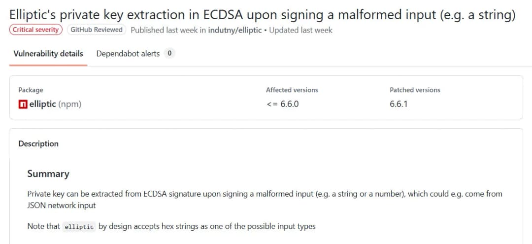تنها یک هفته پیش، یک بیت کوینر دیگر نسبت به یک آسیبپذیری بالقوه دیگر که شبکه بیت کوین را تحت تأثیر قرار میدهد، هشدار داد که در ۱۳ فوریه در GitHub منتشر شد. این ورودی GitHub نسبت به یک ضعف بحرانی در پیادهسازی امضای ECDSA (الگوریتم امضای دیجیتال منحنی بیضوی) که میتواند منجر به افشای کلید خصوصی شود، هشدار داد.