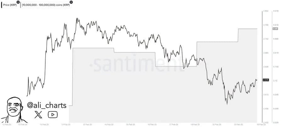 احساسات در میان نهنگهای XRP - که بین ۱۰ تا ۱۰۰ میلیون از این توکن را کنترل میکنند و بخش عمدهای از عرضه را در اختیار دارند - نشان میدهد که این گروه صعودی هستند، زیرا دارایی بیشتری را انباشت کردهاند. در واقع، تحلیل اخیر Santiment نشان داد که در ۴۸ ساعت گذشته، مجموعاً ۱۵۰ میلیون XRP یا XRP به ارزش ۳۸۸ میلیون دلار انباشت شده است.