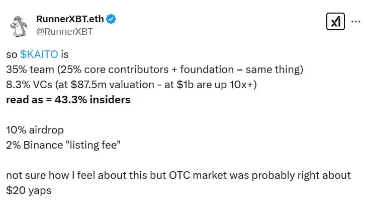 با این حال، تحلیلگران آنچین اشاره کردهاند که بخش قابل توجهی از عرضه توکن به افراد داخلی اختصاص یافته است. طبق گفته محقق آنچین RunnerXBT، ۴۳.۳٪ از کل عرضه Kaito به افراد داخلی اختصاص یافته است که شامل ۳۵٪ برای تیم و ۸.۳٪ برای سرمایهگذاران اولیه میشود.