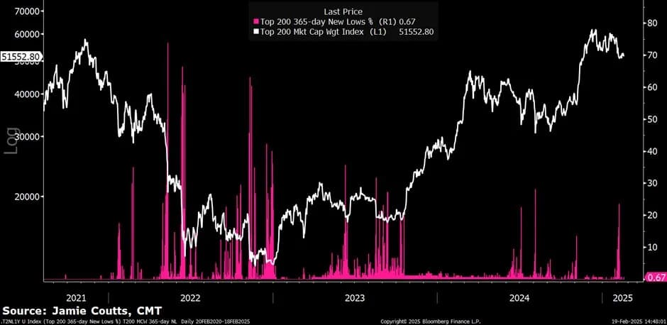 طبق دادههای به اشتراک گذاشته شده توسط جیمی کوتس، تحلیلگر ارشد رمزارز در Real Vision، در یک پست X در ۱۹ فوریه، کوتس اشاره کرد: «ریزش ۷ فوریه باعث شد ۲۴٪ از ۲۰۰ رمزارز برتر به پایینترین سطح ۳۶۵ روزه خود برسند که بالاترین میزان از ۵ آگوست ۲۰۲۴ (۲۸٪) بود که پایینترین سطح اصلاح سال گذشته را نشان میداد.»