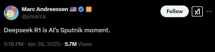مارک آندریسن، سرمایهگذار خطرپذیر، DeepSeek را «لحظه اسپوتنیک هوش مصنوعی» نامید که به آگاهی یک جامعه از نیاز به همگام شدن با پیشرفتهای سریع فناوری در سایر نقاط جهان اشاره دارد. بازارها قطعاً با این شگفتی جمعی واکنش نشان دادند، زیرا سهام فناوری، بیت کوین (BTC) و بازار گستردهتر ارزهای دیجیتال پس از انتشار DeepSeek سقوط کردند.