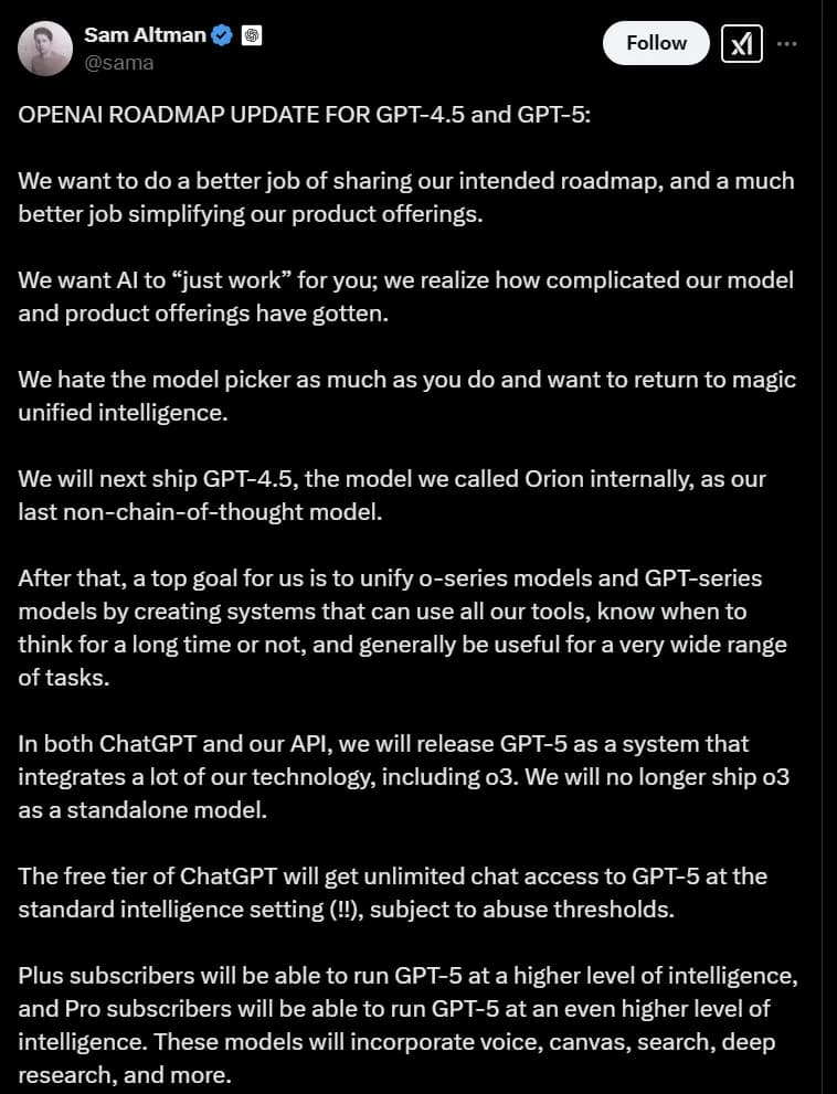 علاوه بر انتظار برای GPT-4.5 در هر لحظه، منبع The Verge گفت که مایکروسافت انتظار دارد مدل قدرتمندتر GPT-5 را در اواخر ماه مه دریافت کند. آلتمن GPT-5 را «به عنوان سیستمی که بسیاری از فناوریهای ما، از جمله o3، را یکپارچه میکند» توصیف کرد که به مدل استدلال جدید OpenAI اشاره دارد. در ۳۱ ژانویه، این شرکت مدل کوچکتری به نام o3-mini را منتشر کرد.