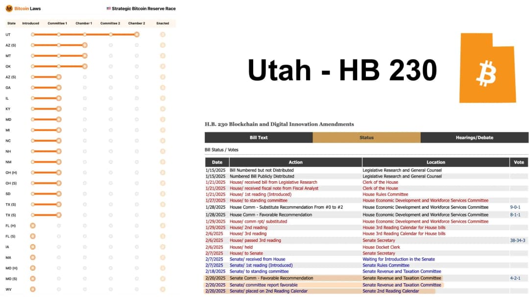 یوتا لایحه ذخیره بیت کوین خود را از کمیته درآمد و مالیات سنای این ایالت عبور داده و بیت کوین را یک قدم به تبدیل شدن به یکی از داراییهای ذخیره ایالت نزدیکتر کرده است. لایحه "اصلاحات بلاکچین و نوآوری دیجیتال" (HB230) در ۲۰ فوریه با رأی ۴-۲-۱ از زیرکمیته درآمد و مالیات یوتا عبور کرد و اکنون در انتظار قرائت دوم و سوم قبل از رأیگیری نهایی در سنا است.