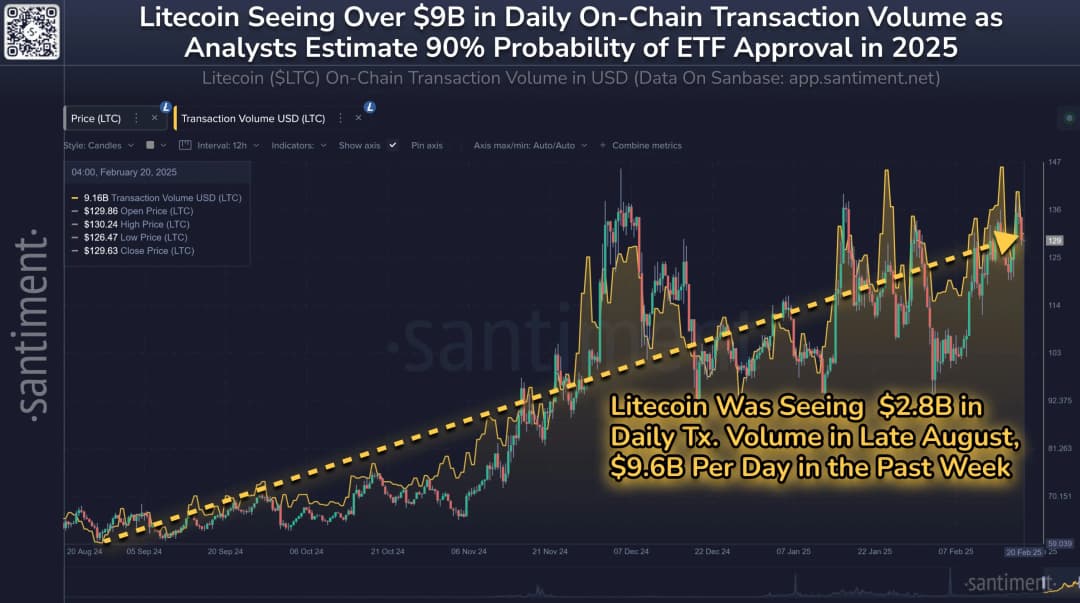 تراکنشهای روزانه در شبکه لایت کوین به ۹.۶ میلیارد دلار در روز رسیده است، زیرا صادرکنندگان صندوقهای قابل معامله در بورس (ETF) در حال اقدام برای فهرست کردن ETFهای پیشنهادی لایت کوین خود در ایالات متحده هستند. ارزش بازار لایت کوین (LTC) از ۲ فوریه تا ۱۹ فوریه ۴۶ درصد افزایش یافته که نشاندهنده افزایش علاقه سرمایهگذاران است.