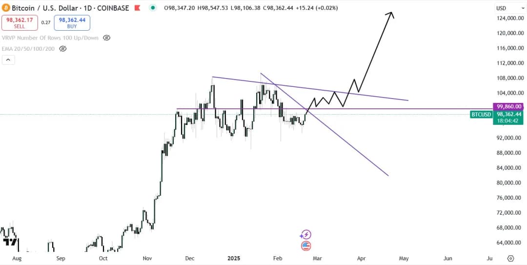بخشی از یک پست در شبکه اجتماعی X در روز قبل نوشته بود: «اگر ۹۸.۴ هزار دلار شکسته شود، حدس من این است که ۱۰۸ هزار دلار هدف بعدی است. واقعاً از روند کاهش حجم معاملات در حالی که قیمت در این محدوده کاهش یافته است، خوشم میآید. امیدوارم شاهد یک شکست قیمتی باشیم!»