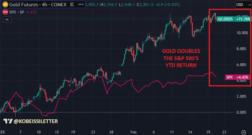 منبع معاملاتی The Kobeissi Letter در یک رشته پست در شبکه اجتماعی X در این باره خاطرنشان کرد: «در واقع، بازدهی طلا بیش از دو برابر بازدهی S&P 500 از ابتدای سال تاکنون بوده است. در سال ۲۰۲۴، طلا و S&P 500 همبستگی بیسابقهای در حدود ۰.۸۱ داشتند.»