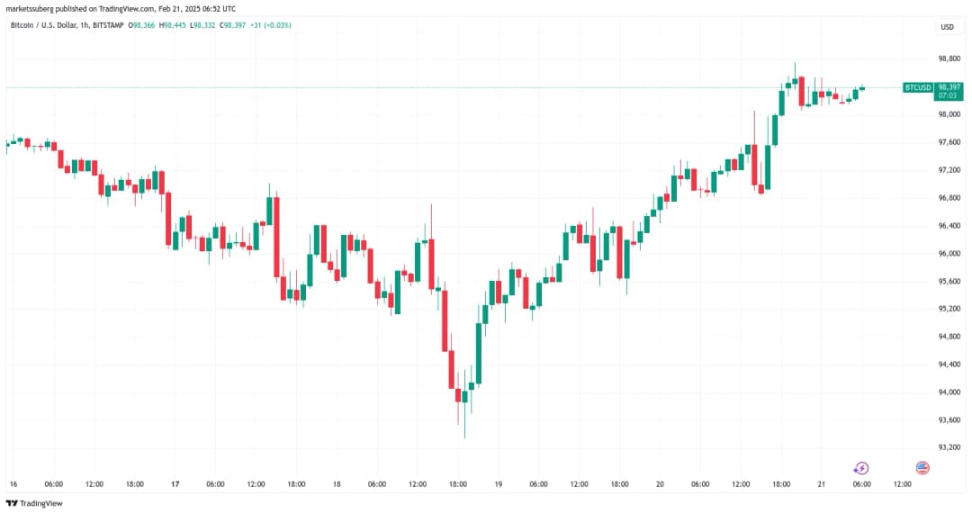 بیت کوین (BTC) در ۲۱ فوریه قیمت ۹۸ هزار دلار را حفظ کرد، پس از اینکه خریداران شاهد بالاترین بسته شدن قیمت روزانه در نزدیک به سه هفته گذشته بودند.