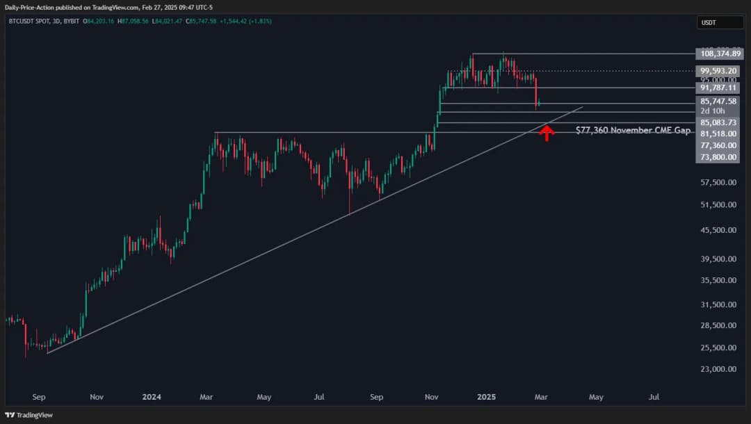 جاستین بنت، معاملهگر محبوب، در ادامه این موضوع همراه با یک نمودار توضیحی نوشت: "بیت کوین مصمم به بستن آن شکاف ۷۷۳۶۰ دلاری CME نوامبر به نظر میرسد که میتواند با خط روند سپتامبر ۲۰۲۳ تلاقی کند. احتمالاً از این منطقه در مارس کمی بازگشت خواهیم داشت، اما نمودار ماهانه نزولی به نظر میرسد مگر اینکه بیت کوین به طرز معجزهآسایی بتواند فوریه را بالای ۹۲ هزار دلار ببندد. شانسها خوب به نظر نمیرسند."