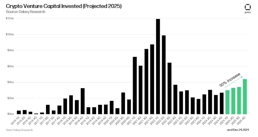 علیرغم پسزمینه اقتصاد کلان نامشخص که با تهدیدات تعرفهای و تورم بالا همراه است، انتظار میرود شرکتهای سرمایهگذاری خطرپذیر امسال سرمایه بیشتری را به استارتاپهای بلاکچین اختصاص دهند. عوامل مثبت امسال شامل دولت طرفدار کریپتو ترامپ و احتمال کاهش نرخ بهره، به ویژه در نیمه دوم سال ۲۰۲۵، هستند.