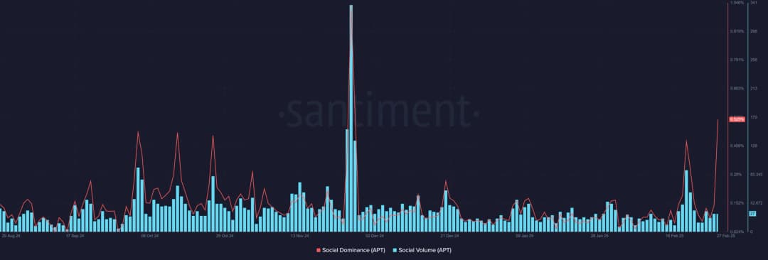 حجم اجتماعی و تسلط APT نیز در حال افزایش است، بهطوریکه تسلط اجتماعی در ۰.۵۳٪ و حجم اجتماعی بهطور پیوسته در حال افزایش است. این رشد نشاندهنده علاقه بیشتر سرمایهگذاران و توجه بیشتر در پلتفرمهای رسانههای اجتماعی است که اغلب منجر به افزایش قیمت میشود. با ورود معاملهگران بیشتر، این میتواند APT را به سمت سطوح قیمتی بالاتر سوق دهد، بهویژه اگر احساسات کلی بازار مثبت شود.