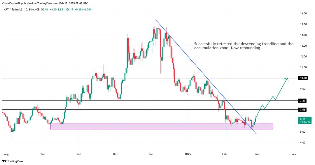 Aptos (APT) در حال حاضر با قیمت ۶.۱۸ دلار معامله میشود که افزایش ۹.۴۸ درصدی را نشان میدهد، زیرا در حال آزمایش یک منطقه حمایت حیاتی است. این حرکت قیمتی توجه سرمایهگذاران را جلب کرده است، زیرا APT نشانههای امیدوارکنندهای از بازگشت احتمالی از سطح حمایت خود نشان میدهد. بهطور تاریخی، این منطقه بهعنوان یک کف قوی عمل کرده و برای سرمایهگذاران خرید پلهای (DCA) فرصتهایی را فراهم کرده است.
