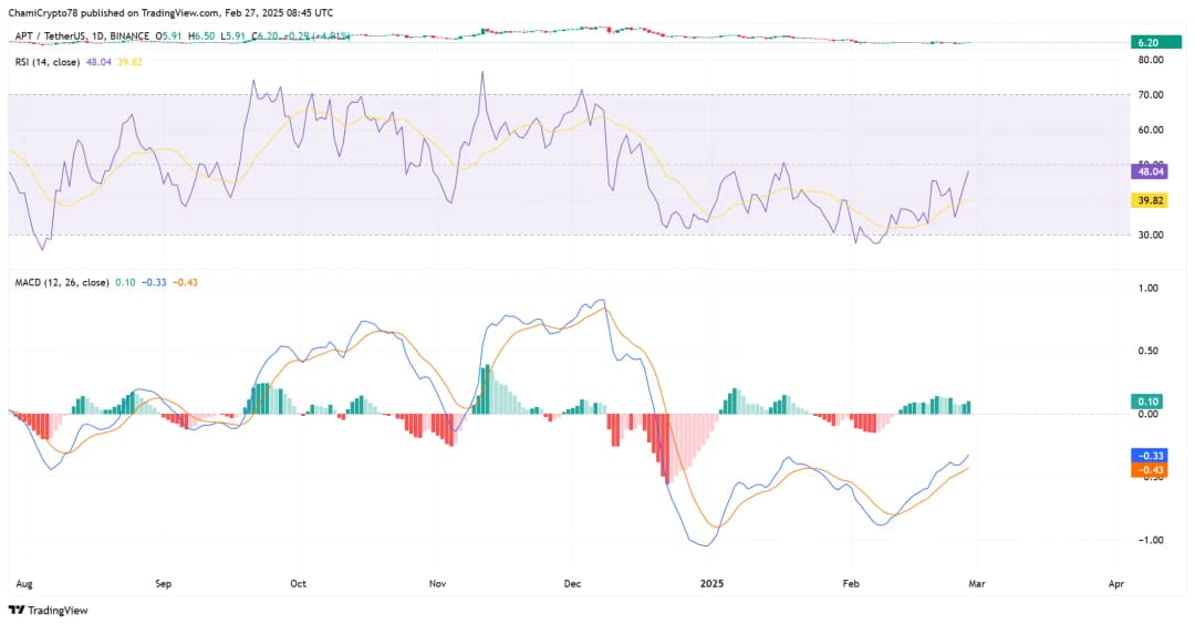 با نگاهی به شاخصهای تکنیکال، شاخص قدرت نسبی (RSI) و همگرایی و واگرایی میانگین متحرک (MACD) نشان میدهند که APT ممکن است آماده بازگشت باشد. در زمان نگارش، RSI در ۴۸.۰۴ بود که شرایط خنثی را نشان میدهد، اگرچه به سمت منطقه اشباع فروش حرکت میکرد. علاوه بر این، MACD تغییر به سمت حرکت صعودی را نشان میداد، بهطوریکه خط آبی در ۰.۱۰ و خط سیگنال نارنجی در -۰.۳۳ قرار داشت. این شاخصها نشان میدهند که APT در حال کسب شتاب صعودی است که میتواند در صورت حفظ حمایت، منجر به افزایش قیمت شود.