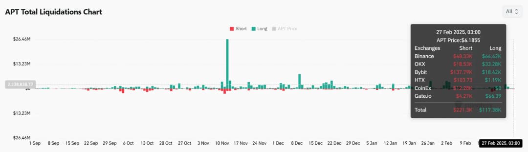 بهره باز (OI) APT با افزایش ۱۵.۶۷٪ به ۱۶۲.۸۳ میلیون دلار رسیده است که نشاندهنده افزایش اعتماد به این دارایی است. علاوه بر این، مجموع لیکوئیدیشنها ۲۲۱.۳ هزار دلار بوده است که ۱۱۷.۳۸ هزار دلار از معاملات خرید و ۱۰۳.۷۳ هزار دلار از معاملات فروش بوده است. این نشان میدهد که معاملهگران روی افزایش بیشتر قیمت شرطبندی میکنند. این افزایش OI همراه با عدم تعادل در دادههای لیکوئیدیشن نشان میدهد که APT میتواند به فشار صعودی خود ادامه دهد.
