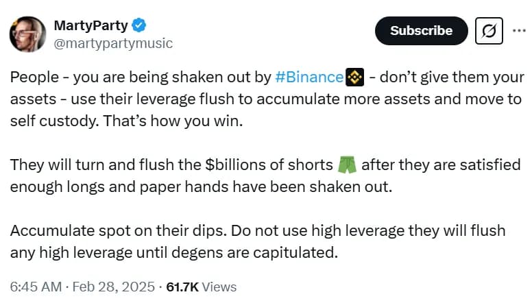 پس از این کاهش، گمانهزنیهایی در شبکههای اجتماعی مطرح شد که برخی از بزرگترین شرکتهای کریپتو، از جمله بایننس، با فروش داراییهای توکن خود در معاملات خارج از بورس (OTC) باعث سقوط بازار شدهاند.