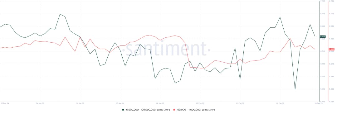 دادههای Santiment نشان میدهد که در ۲۴ ساعت گذشته، آدرسهایی که بین ۱۰ میلیون تا ۱۰۰ میلیون XRP نگه میدارند، ۷۰ میلیون توکن را فروختهاند. علاوه بر این، آدرسهایی که بین ۱۰۰ هزار تا ۱ میلیون XRP دارند، به تدریج در این هفته در حال فروش بودهاند و موقعیت خود را ۲۰ میلیون توکن کاهش دادهاند.