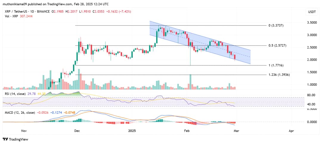 XRP خط روند پایین کانال موازی نزولی خود را شکسته است، زیرا سقوط گسترده بازار کریپتو باعث فروش وحشتزده شده است. این شکست نزولی نشان میدهد که روند کاهشی فعلی ممکن است ادامه یابد. این شکست همچنین نشان میدهد که فروشندگان کنترل بیشتری بر قیمت XRP دارند که میتواند منجر به کاهش قیمت تا حمایت ۱.۷۷ دلار شود. شکستن این حمایت ممکن است باعث کاهش قیمت به زیر ۱.۵۰ دلار و تا ۱.۳۹ دلار شود.