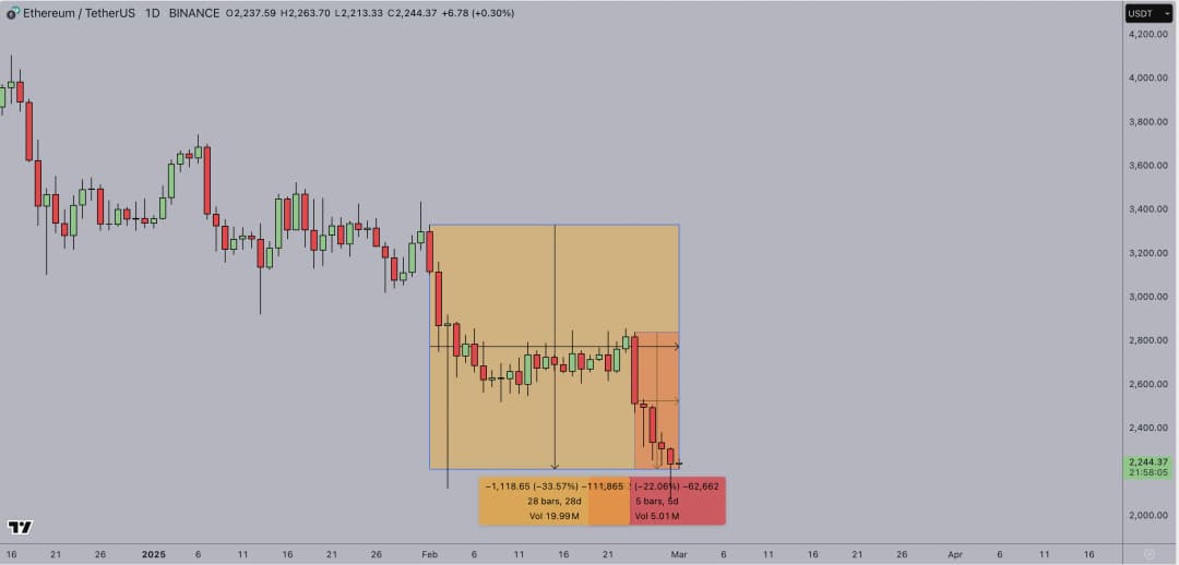 نمودار قیمت ETH در بالا نشاندهنده یک کاهش قابل توجه است، به طوری که ETH تنها در این هفته بیش از ۲۲٪ از ارزش خود را از دست داده است. قیمت از ۲۸۰۰ دلار در روز دوشنبه به نزدیکی ۲۲۲۰ دلار در روز جمعه سقوط کرد. در نمای کلی، قیمت بسته شدن ۲۲۲۰ دلاری اتریوم نشاندهنده کاهش چشمگیر ۳۳٪ نسبت به قیمت باز شدن ۳۲۰۰ دلاری آن در ۱ فوریه است.
