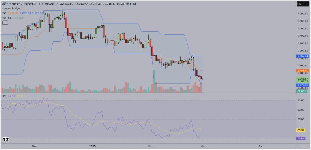 نمودار نشان میدهد که ETH در محدوده پایین کانال Donchian معامله میشود که نشاندهنده فشار فروش مداوم است. شاخص قدرت نسبی (RSI) در ۲۹.۵۳ قرار دارد که شرایط اشباع فروش را تأیید میکند، اما عدم بازگشت قوی نشان میدهد که شتاب نزولی همچنان غالب است.