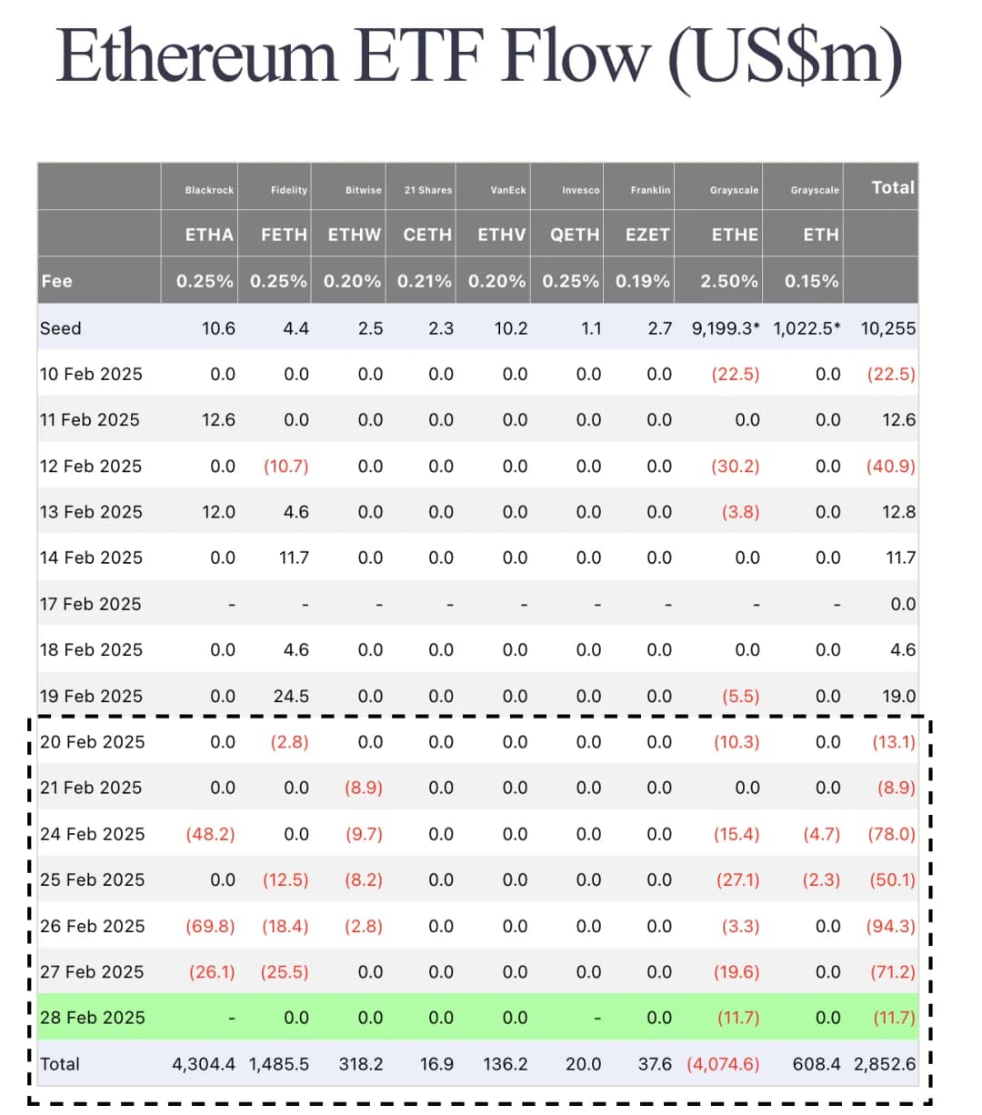توضیح تصویر: جریانهای ETFهای اتریوم (ETH) فوریه ۲۰۲۵ | منبع: SosoValue