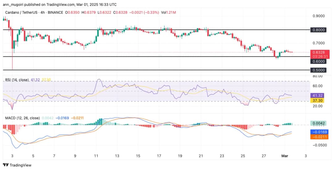 قیمت ADA در 1 مارس 2025 در سطح 0.6349 دلار معامله میشود. بازار قیمت کاردانو دچار نوساناتی است و قیمت در محدوده باریک 0.6349 تا 0.50 دلار باقی مانده است. این امر پس از بهبود بازار کریپتو و افزایش جزئی قیمت بیت کوین رخ داده است.
