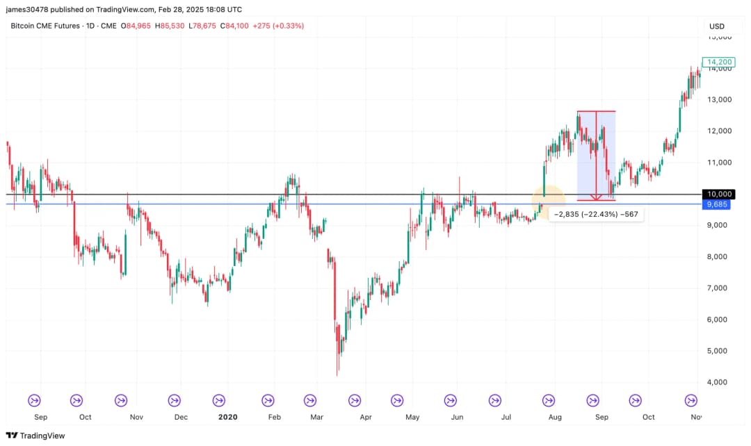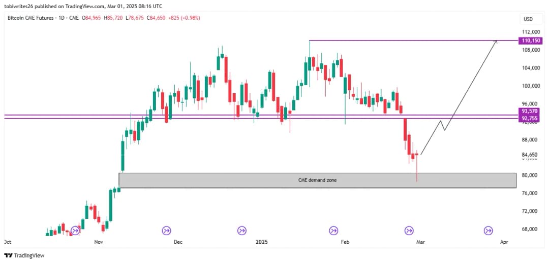 بر اساس ارزیابی AMBCrypto، بیت کوین میتواند الگوی سال ۲۰۲۰ خود را دنبال کند. در آن زمان، پس از رسیدن قیمت به بالای ۱۲,۰۰۰ دلار، یک کاهش شدید ۲۲.۴۳٪ برای پر کردن شکاف CME در زیر آن رخ داد و سپس یک اوج تاریخی جدید فراتر از آن سطح ثبت شد. بیت کوین اخیراً مسیر مشابهی را طی کرده است و پس از کاهش ۲۸.۵۷٪ به یک شکاف CME بین ۸۰,۶۷۰ و ۷۷,۹۳۰ رسیده است. بسته به موقعیت آنها، این شکافها میتوانند به عنوان سطوح تقاضا و عرضه عمل کنند - در این مورد، یک سطح تقاضا.